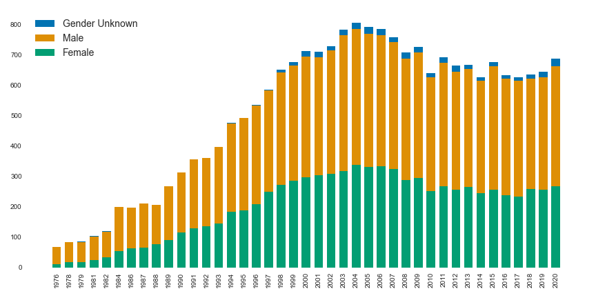 Bar chart of freelancer numbers by year from 1976 - 2020 broken down by gender. Roughly, the gender balance is 60% male, 40% female from the early 90s to 2020. Earlier than that the majority of crew were male. In some cases gender is unknown and this constitutes a small percentage (less than 10%) between 1998 and 2020