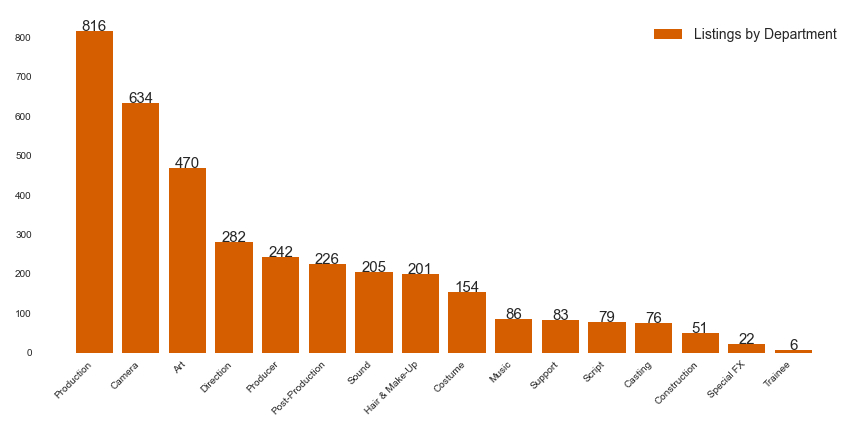 Bar chart showing total listings in each department: Production: 816, Camera: 634, Art: 470, Direction: 282, Producer: 242, Post-production: 226, Sound: 205, Hair & Make-up: 201, Costume: 154, Music: 86, Support: 83, Script:79 , Casting: 76, Construction: 51, Special FX: 22, Trainee: 6.